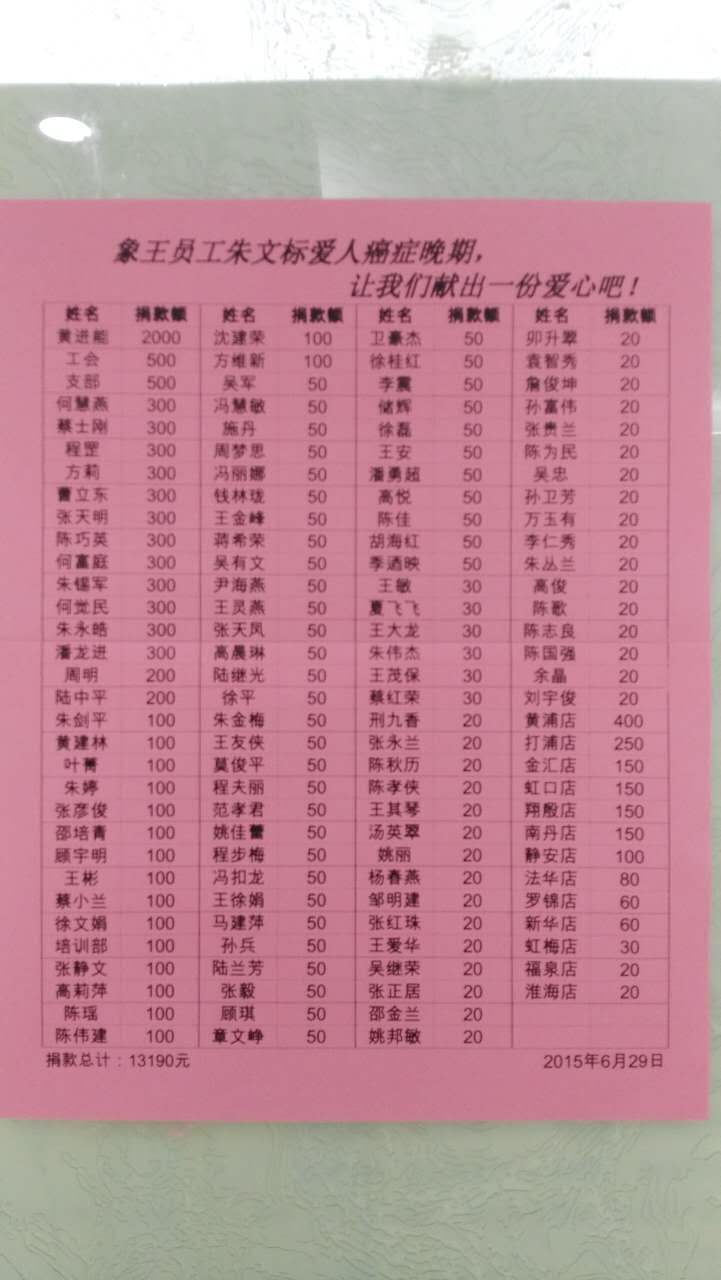 近日,象王黨支部、工會組織公司員工為本公司身患晚期癌癥的員工家屬進行募捐。公司各部門、工廠、物流中心、各直營門店員工得知消息后,紛紛獻出自己的一片愛心。象王董事長黃進能個人捐款2000元。僅短短半天時間,即籌得募捐款13190元,送到了員工家屬的病床前,充分體現(xiàn)了象王大家庭的溫暖和凝聚力。?